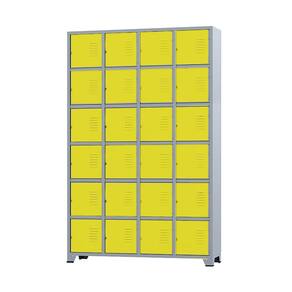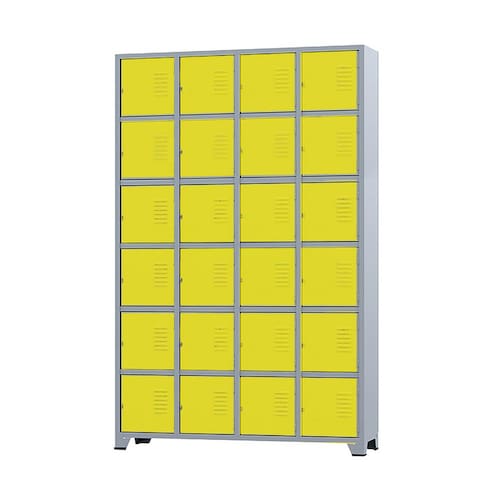 CONEXÃO OFFICEArmário Roupeiro de aço para vestiário,ideal para academias, surpermercados, empresa e para uso geral. Produzido em aço chapa 26 0,45mm de alta qualidade com tratamento anti-ferruginoso, o acabamento em sistema de pintura eletrostática a alta temperatura epóxi, tambem garante maior durabilidade da cor e resistencia a ferrugem. Possui 24 portas com venezianas para ventilação, compartimentos de tamanhos médios independentes sem divisórias internas, que garante que você consiga armazenar itens como bolsas, mochilas e entre outros. O fechamento das portas é através de CHAVE. Características- Quantidade de Portas: 24- Cor: Cinza Padrão / Portas Amarelas- Chapa: 26 / 0,45mm- Medida das Portas/ Vãos: 029Alt x 026Larg- Sistema de Ventilação: Veneziana- Fechamento: CHAVE- Quantidade de cabides por porta: 0- Pés removíveis: Não- Desmontável: Não ( Exceto portas que podem ser trocadas ).- Pintura: Epóxi PóALTURA: 197cmLARGURA: 122cmPROFUNDIDADE: 36cmPESO: 50kgGARANTIA: 3 MesesEspecificação de chapa e acabamento: Roupeiro produzido em chapa de aço tratada com antiferruginoso por fosfatização e pintura epóxi-pó por processo eletrostático.