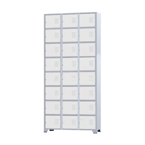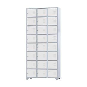 CONEXÃO OFFICEArmário Roupeiro de aço para vestiário,ideal para academias, surpermercados, empresa e para uso geral. Produzido em aço chapa 26 0,45mm de alta qualidade com tratamento anti-ferruginoso, o acabamento em sistema de pintura eletrostática a alta temperatura epóxi, tambem garante maior durabilidade da cor e resistencia a ferrugem. Possui 24 portas com venezianas para ventilação, compartimentos de tamanhos médios independentes sem divisórias internas, que garante que você consiga armazenar itens como bolsas, mochilas e entre outros. O fechamento das portas é através de CHAVE. Características- Quantidade de Portas: 24- Cor: Cinza Padrão / Portas Brancas- Chapa: 26 / 0,45mm- Medida das Portas/ Vãos: 021Alt x 026Larg- Sistema de Ventilação: Veneziana- Fechamento: CHAVE- Quantidade de cabides por porta: 0- Pés removíveis: Não- Desmontável: Não ( Exceto portas que podem ser trocadas ).- Pintura: Epóxi PóALTURA: 197cmLARGURA: 92cmPROFUNDIDADE: 36cmPESO: 35kgGARANTIA: 3 MesesEspecificação de chapa e acabamento: Roupeiro produzido em chapa de aço tratada com antiferruginoso por fosfatização e pintura epóxi-pó por processo eletrostático.