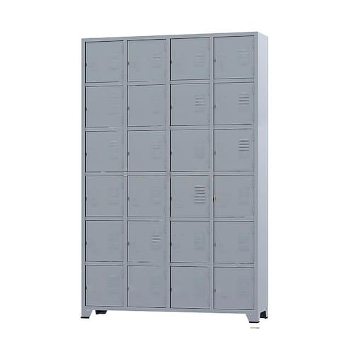 Armário Roupeiro de aço para vestiário,ideal para academias, surpermercados, empresa e para uso geral. Produzido em aço chapa 26 0,45mm de alta qualidade com tratamento anti-ferruginoso, o acabamento em sistema de pintura eletrostática a alta temperatura epóxi, tambem garante maior durabilidade da cor e resistencia a ferrugem. Possui 24 portas com venezianas para ventilação, compartimentos de tamanhos médios independentes sem divisórias internas, que garante que você consiga armazenar itens como bolsas, mochilas e entre outros. O fechamento das portas é através de pitão para cadeado.