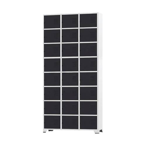 CONEXÃO OFFICEArmário Roupeiro de aço para vestiário,ideal para academias, surpermercados, empresa e para uso geral. Produzido em aço chapa 26 0,45mm de alta qualidade com tratamento anti-ferruginoso, o acabamento em sistema de pintura eletrostática a alta temperatura epóxi, tambem garante maior durabilidade da cor e resistencia a ferrugem. Possui 24 portas com venezianas para ventilação, compartimentos de tamanhos médios independentes sem divisórias internas, que garante que você consiga armazenar itens como bolsas, mochilas e entre outros. O fechamento das portas é através de CHAVE. Características- Quantidade de Portas: 24- Cor: Cinza Padrão / Portas Pretas- Chapa: 26 / 0,45mm- Medida das Portas/ Vãos: 021Alt x 026Larg- Sistema de Ventilação: Veneziana- Fechamento: CHAVE- Quantidade de cabides por porta: 0- Pés removíveis: Não- Desmontável: Não ( Exceto portas que podem ser trocadas ).- Pintura: Epóxi PóALTURA: 197cmLARGURA: 92cmPROFUNDIDADE: 36cmPESO: 35kgGARANTIA: 3 MesesEspecificação de chapa e acabamento: Roupeiro produzido em chapa de aço tratada com antiferruginoso por fosfatização e pintura epóxi-pó por processo eletrostático.