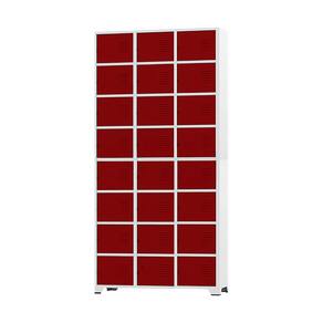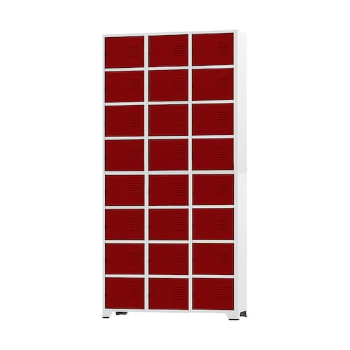 CONEXÃO OFFICEArmário Roupeiro de aço para vestiário,ideal para academias, surpermercados, empresa e para uso geral. Produzido em aço chapa 26 0,45mm de alta qualidade com tratamento anti-ferruginoso, o acabamento em sistema de pintura eletrostática a alta temperatura epóxi, tambem garante maior durabilidade da cor e resistencia a ferrugem. Possui 24 portas com venezianas para ventilação, compartimentos de tamanhos médios independentes sem divisórias internas, que garante que você consiga armazenar itens como bolsas, mochilas e entre outros. O fechamento das portas é através de chave. Características- Quantidade de Portas: 24- Cor: Cinza Padrão / Portas Vermelhas- Chapa: 26 / 0,45mm- Medida das Portas/ Vãos: 021Alt x 026Larg- Sistema de Ventilação: Veneziana- Fechamento: CHAVE- Quantidade de cabides por porta: 0- Pés removíveis: Não- Desmontável: Não ( Exceto portas que podem ser trocadas ).- Pintura: Epóxi PóALTURA: 197cmLARGURA: 92cmPROFUNDIDADE: 36cmPESO: 35kgGARANTIA: 3 MesesEspecificação de chapa e acabamento: Roupeiro produzido em chapa de aço tratada com antiferruginoso por fosfatização e pintura epóxi-pó por processo eletrostático.