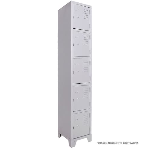 CONEXÃO OFFICEArmário Roupeiro de aço para vestiário,ideal para academias, surpermercados, empresa e para uso geral. Produzido em aço chapa 26 0,45mm de alta qualidade com tratamento anti-ferruginoso, o acabamento em sistema de pintura eletrostática a alta temperatura epóxi, tambem garante maior durabilidade da cor e resistencia a ferrugem. Possui 5 portas com venezianas para ventilação, compartimentos de tamanhos médios independentes sem divisórias internas, que garante que você consiga armazenar itens como bolsas, mochilas e entre outros. O fechamento das portas é através de chave. Características- Quantidade de Portas: 5- Cor: Cinza Padrão- Chapa: 26 / 0,45mm- Medida das Portas/ Vãos: 035Alt x 026Larg- Sistema de Ventilação: Veneziana- Fechamento: chave- Quantidade de cabides por porta: 0- Pés removíveis: Não- Desmontável: Não ( Exceto portas que podem ser trocadas ).- Pintura: Epóxi PóALTURA: 197cmLARGURA: 32cmPROFUNDIDADE: 36cmPESO: 25 KgGARANTIA: 3 MesesEspecificação de chapa e acabamento: Roupeiro produzido em chapa de aço tratada com antiferruginoso por fosfatização e pintura epóxi-pó por processo