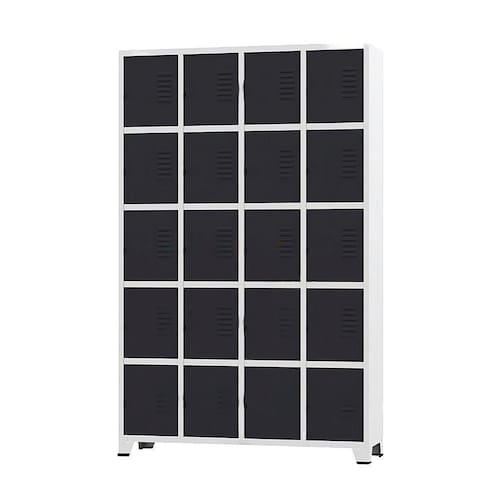 Armário Roupeiro de aço para vestiário,ideal para academias, surpermercados, empresa e para uso geral. Produzido em aço chapa 26 0,45mm de alta qualidade com tratamento anti-ferruginoso, o acabamento em sistema de pintura eletrostática a alta temperatura epóxi, tambem garante maior durabilidade da cor e resistencia a ferrugem. Possui 20 portas com venezianas para ventilação, compartimentos de tamanhos médios independentes sem divisórias internas, que garante que você consiga armazenar itens como bolsas, mochilas e entre outros. O fechamento das portas é através de pitão para cadeado.