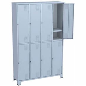 CONEXÃO OFFICEArmário Roupeiro de aço para vestiário,ideal para academias, surpermercados, empresa e para uso geral. Produzido em aço chapa 26 0,45mm de alta qualidade com tratamento anti-ferruginoso, o acabamento em sistema de pintura eletrostática a alta temperatura epóxi, tambem garante maior durabilidade da cor e resistencia a ferrugem. Possui 8 portas com venezianas para ventilação, compartimentos de tamanhos médios independentes com 1 prateleira, que garante que você consiga armazenar itens como bolsas, mochilas e entre outros. O fechamento das portas é através de chave. Características:- Quantidade de Portas: 08- Cor: Cinza Padrão- Chapa: 26 / 0,45mm- Medida das Portas/ Vãos: 092Alt x 027Larg- Sistema de Ventilação: Veneziana- Fechamento: chave - Quantidade de cabides por porta: 2- Prateleira: 1 - Pés removíveis: Não- Desmontável: Não ( Exceto portas que podem ser trocadas ).- Pintura: Epóxi PóALTURA: 197cmLARGURA: 122cmPROFUNDIDADE: 036cmPESO: 50kgGARANTIA: 1 MesesEspecificação de chapa e acabamento: Roupeiro produzido em chapa de aço tratada com antiferruginoso por fosfatização e pintura epóxi-pó por processo eletrostático.