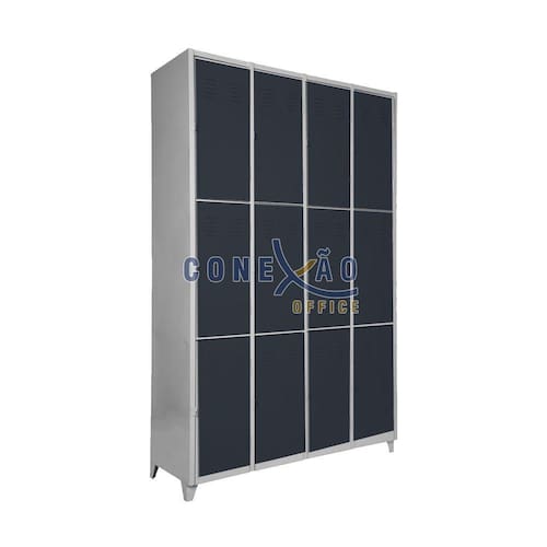 Armário Roupeiro de aço para vestiário, produzido em aço chapa 26 0,45mm, possui 12 portas com venezianas para ventilação, compartimentos de tamanhos medios independentes sem divisórias internas, fechamento das portas através de pitão para cadeado.