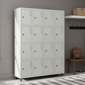 Fabricado em chapa de aço nº 26 (0,045cm), o roupeiro conta com 16 portas individuais, tratamento anticorrosão e pintura eletrostática a pó.