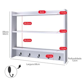 Ele conta com duas prateleiras e cinco ganchos, atributos que podem ser utilizados para auxiliar na organização. Suas prateleiras são ideais para acomodar porta-temperos, peças decorativas e utensílios de cozinha. Já seus ganchos podem ser utilizados para pendurar canecas, xicaras, panos de prato e até chaves, fazendo do armário um produto versátil que pode ser utilizado em diversos ambientes da casa.