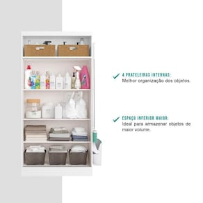 O Armário de Lavanderia Multi Carraro é a peça ideal para ser utilizada em diferentes cômodos da casa, ajudando a manter todos os objetos em ordem e assim facilitando as tarefas do dia a dia. É uma solução indispensável para quem precisa de mais espaço e organização para o ambiente, pois conta com diversas prateleiras internas, nicho superior, ganchos laterais e portas de correr.