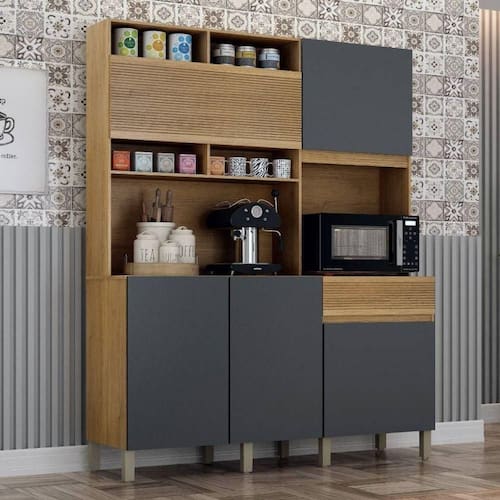 Transforme seu ambiente com praticidade e estilo, com nosso armario de cozinha Canastra! Com um paneleiro espacoso e nicho perfeito para micro-ondas, ele organiza tudo de forma inteligente. A gaveta com detalhes ripados traz um toque de elegancia, enquanto os nichos para decoracoes sao ideais para exibir suas canecas favoritas ou deixar os temperos a mao. O acabamento cria um visual clean e moderno, perfeito para cozinhas pequenas ou medias que precisam de um upgrade sem ocupar muito espaco!
