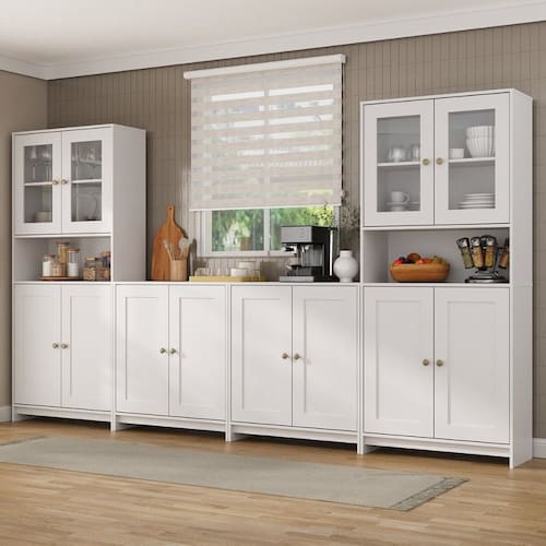 Com quatro módulos, o conjunto de armários americanos da Decibal proporciona muita funcionalidade, beleza e modernismo para o seu ambiente, deixando sua cozinha funcional, com estilo e refinamento. São dois armários com portas em vidro e prateleiras internas espaçosas, e dois balcões muito espaço para a organização da sua cozinha. Todas as peças são numeradas, para facilitar a montagem do produto. Acabamento da Prateleira: Pintura UV Escala de Brilho da Prateleira: Semi-Brilho Acabamento da Porta: Pintura UV Escala de Brilho da Porta: Semi-Brilho Ambiente Principal: Cozinha codigo_ean: 7900288111593 Complexidade da Montagem: Média: pode ser montado por mais de uma pessoa e/ou necessite de maior conhecimento para montagem Cor: Branco Gelo Cor do Produto: Branco Gelo Cor Interna: Branco Gelo Escala de Brilho: Semi-Brilho Espessura do Material da Estrutura: 15 mm Itens Inclusos: 2 Armários, 2 Balcões, Kit Ferragens e Manuais de Montagem. Linha ou Coleção: Americano Manual de Montagem e Instalação: https://product-hub-prd.madeiramadeira.com.br/984288/documents/c332a644-0f82-4c4d-8696-caa3aef98f412784749633517437658457874.pdf Marca: Decibal Material da Dobradiça/Corrediça da Porta: Metálica Material da Porta: MDP Material da Prateleira: MDP modular: Sim Necessita Montagem: Sim Origem do Produto: Nacional Peso: 138 kg Peso Máximo por Prateleira: 3 kg Possui Espelho: Não Possui Possui Pés: Não Possui Portas: Sim Possui Prateleiras: Sim Possui Vidro: Sim Produto Montado: Sim Recomendações de Uso, Manutenção e Limpeza: Utilize pano umedecido com água Sapatas Niveladoras: Não Sistema de Montagem: Parafusos, cavilhas, pregos e buchas. Suporta Até (kg): 84 kg Tipo de Dobradiça/Corrediça da Porta: Simples Tipo de Puxador da Porta: Externo