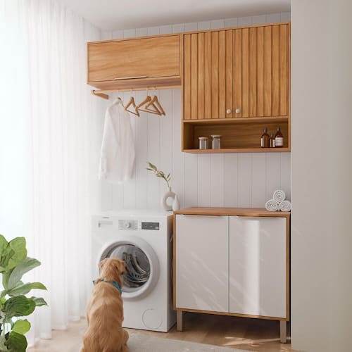 Nosso Lavanderia Modulada Divina oferece a solução ideal para organizar sua área de serviço de forma prática e elegante. Com 2 armários aéreos de 80 cm e 1 balcão de 80 cm, ela foi criada para oferecer um amplo espaço de armazenamento para produtos de limpeza, ferramentas e outros itens essenciais e necessários para atender sua demanda diária. Os armários aéreos otimizam o uso do espaço vertical, pois possui portas de bater com detalhe ripado e nichos que dão um toque elegante e funcional a sua área de serviço. Já o balcão mantém tudo acessível e bem organizado. A Lavanderia Modulada Divina faz parte da coleção Inspirar e Transformar e vai trazer praticidade para Inspirar e Transformar seu dia a dia! Acabamento da Porta: Pintura UV Acabamento da Prateleira: Pintura UV Acabamento dos Pés: ABS Acompanha Manual de Instalação: Sim Acompanha Tampo: Sim Altura dos Pés: 17 cm Altura Máxima dos Pés: 17.0000 Ambiente Principal: Área de Serviço codigo_ean: 7900288159465 Complexidade da Montagem: Média: pode ser montado por mais de uma pessoa e/ou necessite de maior conhecimento para montagem Cor: Cinamomo / Branco Cor do Produto: Cinamomo / Branco Cor Flex: Não Cor Interna: Cinamomo Escala de Brilho: Fosco Escala de Brilho da Porta: Fosco Escala de Brilho da Prateleira: Fosco Espessura da Chapa: 15 mm Fita Integrada: Não Itens Inclusos: 2 Aéreos, 1 Balcão e Manual de Montagem Linha ou Coleção: Divina Manual de Especificação Técnica: https://product-hub-prd.madeiramadeira.com.br/404248137/documents/468e5fbc-2bec-4bac-934f-2a52621bc3bc2946105528517479360133607.pdf Manual de Montagem e Instalação: https://product-hub-prd.madeiramadeira.com.br/404248137/documents/dbc2a7cf-f9d5-4744-b9b9-6d971316192d2946103528517479360095788.pdf Marca: MGM Móveis Material da Porta: MDF Material da Prateleira: MDF Material do Fundo: HDF Material do Puxador: ABS Material do Puxador da Porta: ABS Material dos Pés: ABS Material Principal: MDF modular: Sim Montagem Flex: Não Necessita Montagem: Sim O Módulo Pode ser utilizado individualmente: Sim Origem do Produto: Nacional Pés Reguláveis: Sim Pés Removíveis: Sim Peso: 60,4 kg Peso Máximo por Prateleira: 5 kg Porta com Fechadura: Não Possui Cabideiros: Não Possui Chave: Não Possui Espelho: Não Possui Nichos: 01 Possui Pés: 04 Possui Portas: Sim Possui Suporte para Vassoura: Não Possui Tábua: Não Possui Tulha/Cesto: Não Possui Vidro: Não Prateleiras Removíveis: Não Quantidade de Prateleiras: 05 Prateleiras Quantidade do Produto: 3 Recomendações de Uso, Manutenção e Limpeza: Utilizar pano umidecido Resistente à Chuva: Não Sapatas Niveladoras: Sim Sistema de Montagem: Parafusos, Cavilhas e Minifix Suporta Até (kg): 30 kg Tipo de Armário Multiuso: Armário Multiuso Tipo de Dobradiça/Corrediça da Porta: Soft Close Tipo de Porta: Misto (Bater e Basculante) Tipo de Puxador da Porta: Externo