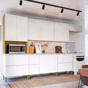 Essa cozinha combina praticidade, organização e um design moderno, ideal para aproveitar o espaço com elegância e funcionalidade. Ela inclui um Paneleiro com 3 portas e 1 gaveta, um armário de 120cm com porta articulada, um armário de 80cm também com porta articulada, um armário basculante de 80cm, um balcão de 120cm com 3 portas e 2 gavetas com tampo e painel e um balcão de 80cm com 1 porta basculante e 1 gaveta, também com tampo e painel. Acabamento da Prateleira: Pintura UV Escala de Brilho da Prateleira: Semi-Brilho Acabamento da Gaveta: Pintura UV Escala de Brilho da Gaveta: Semi-Brilho Acabamento da Porta: Pintura UV Escala de Brilho da Porta: Semi-Brilho Acompanha Rodapé Decorativo: Não Acompanha Tampo: Sim Altura dos Pés: 17 cm Altura Máxima dos Pés: 17.0000 Ambiente Principal: Cozinha Balcão Suporta Pia: Sim codigo_ean: 7900288018700 Complexidade da Montagem: Alta: deve ser montado por um montador especializado Cor: Freijó Cor do Produto: Freijó Cor Interna: Freijó/Branco Escala de Brilho: Semi-Brilho Espessura do Material da Estrutura: 12 mm Espessura do Tampo: 15 mm Gaveta com Chave: Não Itens Inclusos: Não Linha ou Coleção: Art Manual de Montagem e Instalação: https://product-hub-prd.madeiramadeira.com.br/969494/documents/e72e9a37-fba9-432e-b5f0-eae83e021de02541038613917309145921581.pdf Marca: Kits Paraná Material da Dobradiça/Corrediça da Porta: Metálica Material da Gaveta: MDP Material da Porta: MDP Material da Prateleira: MDP Material dos Pés: Plástico modular: Sim Necessita Montagem: Sim O Balcão Acompanha Pia: Não Origem do Produto: Nacional Pés Reguláveis: Sim Peso: 179,83 kg Peso Máximo por Gaveta: 10 kg Peso Máximo por Prateleira: 10 kg Possui Espelho: Não Possui Possui Pés: 13 Possui Portas: Sim Possui Prateleiras: Sim Possui Rodízio: Não Possui Vidro: Não Produto Montado: Sim Recomendações de Uso, Manutenção e Limpeza: Sim Sapatas Niveladoras: Não Sistema de Montagem: Sim Suporta Até (kg): 10 kg Tamanho Indicado da Pia: 1200 Tipo de Corrediça da Gaveta: Metálica Telescópica Tipo de Dobradiça/Corrediça da Porta: Simples Tipo de Puxador da Gaveta: Embutido Tipo de Puxador da Porta: Embutido