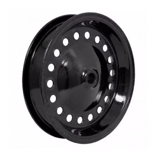 Super resistente e fácil de aplicar o aro para carrinho de mão possui corpo em aço de alta qualidade, acabamento brilhante pintado na cor preta, furo central de 25mm e encaixe perfeito em pneus com medida de 3,25 x 8.