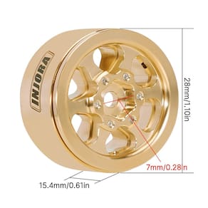 Especificações: Número da peça: W1011 Material: Latão Deslocamento: -4,7 mm (-0,5 cm) Diâmetro externo: 28 mm (1,1 pol.) Largura: 15,4 mm (0,61 pol.) Cubo da roda: 7 mm (0,28 pol.) Cada peso: 40 g/peças (0 kg) Conteúdo da embalagem: 4 rodas de carro RC de 2,5 cm - - O deslocamento de 4,7 mm oferece uma postura mais ampla, melhorando a presença do seu veículo. - A roda é feita de latão, maior durabilidade. - Cada roda pesa 40 g, oferecendo peso adicional no ponto mais baixo do seu veículo para ajudar a maximizar a estabilidade. - Diâmetro externo: 28 mm, largura: 15,4 mm (0,61 pol), cubo da roda: 7 mm (0,28 pol). - Adequado para SCX24 FCX24 TRX4M Ascent18 1/18 1/24 peça de atualização RC.