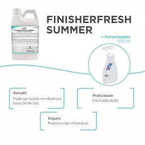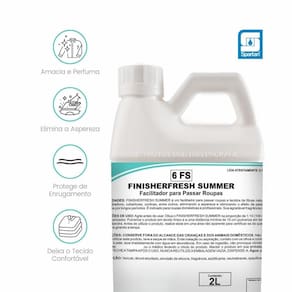 Finisherfresh summer é um facilitador para passar roupas e tecidos de fibras naturais e sintéticas presentes em toalhas lençóis, edredons, cobertores, cortinas, entre outros, eliminando a aspereza e otimizando o efeito de passadoria, deixando os tecidos macios e perfumados por longos períodos.