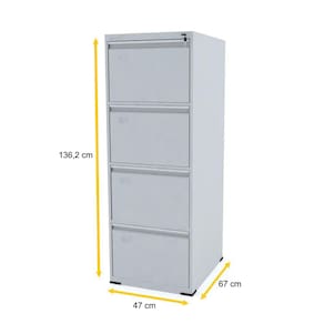 - Arquivo com 4 gavetas, confeccionado em chapa de aço 26 (0,45 mm) laminada. Parte superior em chapa 24 (0,60 mm).