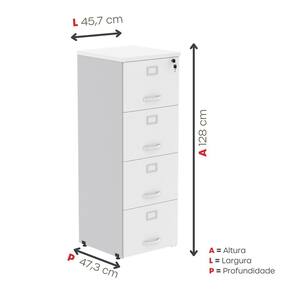 Suas 4 gavetas espaçosas oferecem excelente capacidade para armazenar e organizar documentos, pastas e materiais de uso frequente, mantendo tudo sempre acessível e bem distribuído. O design funcional proporciona facilidade de uso, enquanto a robustez do móvel assegura longa vida útil mesmo em rotinas intensas.