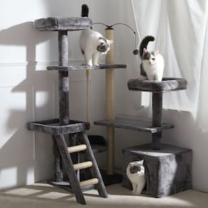 Desenhado por pessoas apaixonadas por gatos, esse luxuoso arranhador é composto por: Casa grande, três camas espaçosas, três poleiros, base, escada, brinquedo giratório, brinquedo em balanço e corda de sisal.