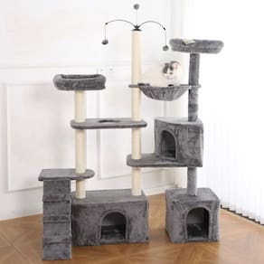 Desenhado por pessoas apaixonadas por gatos, esse luxuoso arranhador é composto por: Três casas grandes, duas camas espaçosas com borda macia, cesto, três poleiros, escada e brinquedo giratório.