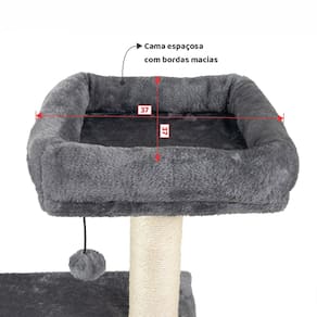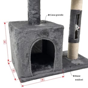 Desenhado por pessoas apaixonadas por gatos, esse luxuoso arranhador é composto por: Casa grande, cama espaçosa com bordas macias, poleiro, base estável e dois brinquedos em balanço, sendo um em formato de bolinha e o outro em formato de ratinho.