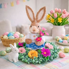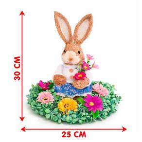 Deixe sua Páscoa ainda mais charmosa com este lindo arranjo decorativo de coelho com flores. Ideal para centro de mesa, aparador, balcão ou prateleira, ele traz um toque delicado e acolhedor para a decoração pascal, combinando perfeitamente com ambientes clássicos ou modernos