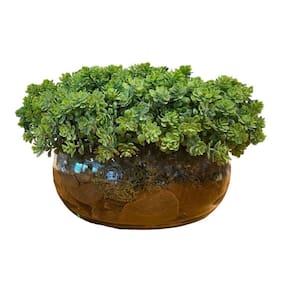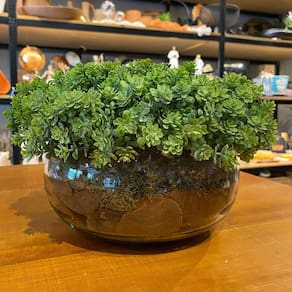 Arranjo permanente de verdinho em efeito hiper-realista com vaso incolor.