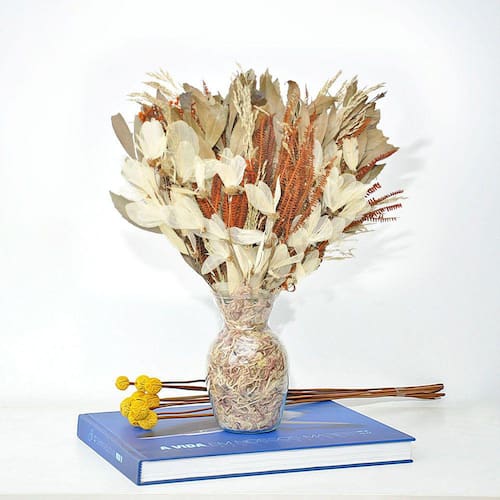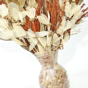 Todos os nossos arranjos e buquês são criados com flores naturais desidratadas artesanalmente. Por ser um processo manual, isso garante que cada arranjo seja único em sua composição.