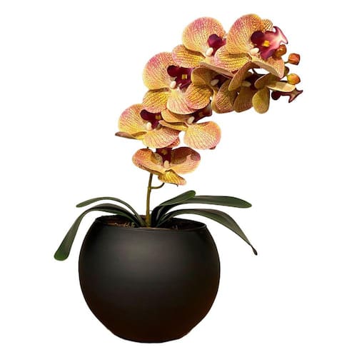 Arranjo permanente de Orquídea em efeito hiper-realista com vaso preto.