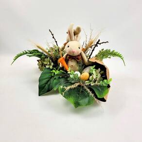 - Elementos Encantadores: Apresentando coelhos em pelúcia de cor neutra entre as flores permanentes, este arranjo traz um toque lúdico e festivo à sua decoração de Páscoa.