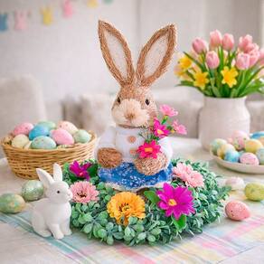 Deixe sua Páscoa ainda mais charmosa com este lindo arranjo decorativo de coelho com flores. Ideal para centro de mesa, aparador, balcão ou prateleira, ele traz um toque delicado e acolhedor para a decoração pascal, combinando perfeitamente com ambientes clássicos ou modernos