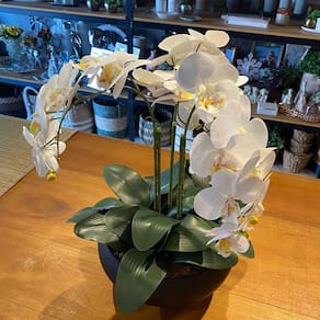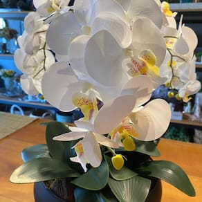 Arranjo permanente de Orquídea em efeito hiper-realista com vaso preto.