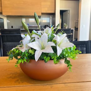 Arranjo Centro de Mesa Lírio Rosa Permanente Grande com Vaso terracota.