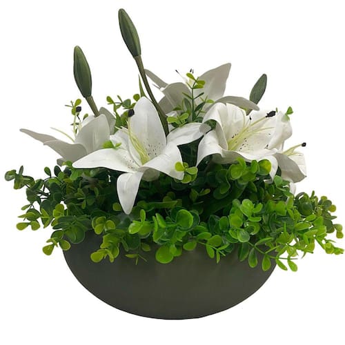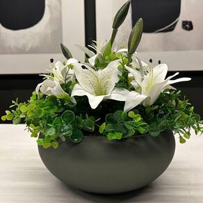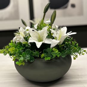 Arranjo Centro de Mesa Lírio Branco Permanente Grande com Vaso verde Musgo