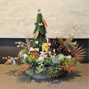 Transforme sua mesa em um verdadeiro espetáculo natalino com nosso arranjo exclusivo, que traz todo o charme e magia de uma vila de Natal. Esta peça única é perfeita para quem deseja celebrar as festas com elegância e um toque especial.