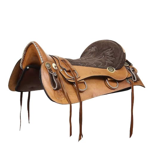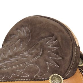 Arreio da marca A Pantaneira modelo Rabo de Pato, utilizado em Muares e Cavalos, fabricado em couro de alta qualidade com detalhes em bordados, costuras reforçadas e inervos trançados, presente também margaridas com pintura envelhecida, tentos em couro nas laterais, assento em couro acolchoado com tamanho livre de 19" totalmente trabalhado, ferragens em aço inox, armação em madeira inervada e suador com revestimento em couro.