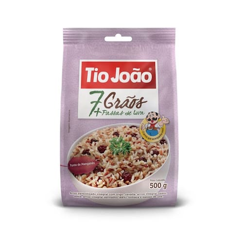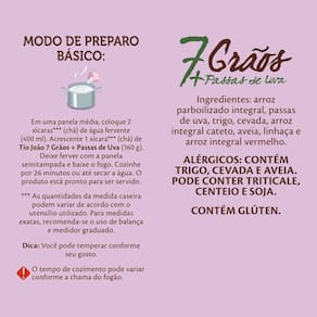Arroz integral parboilizado, passas de uva, trigo, cevada, arroz cateto, aveia, arroz vermelho e linhaça.