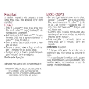 Em uma tigela refratária com bordas altas colocar: 1 xícara (200g) de arroz Meu Biju. 1 colher (chá) de sal, 2 colheres (sopa) de óleo e 2 xícaras de água (460ml). Mexer bem. Colocar a tigela refratária com bordas altas semitampada no micro-ondas na potência máxima por 15 minutos*. Desligar o micro-ondas e esperar 5 minutos. Servir.
