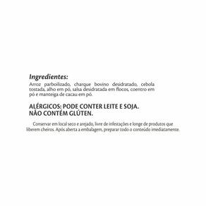 Arroz parboilizado, charque bovino desidratado, cebola tostada, alho em pó, salsa desidratada em flocos, coentro em pó, manteiga de cacau em pó e aroma idêntico ao natural de carne. ALÉRGICOS: CONTÉM DERIVADOS DE SOJA. PODE CONTER LEITE. NÃO CONTÉM GLÚTEN.