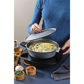 Corpo de alumínio com espessura de 3 mm que proporciona cozimento rápido e uniforme.Revestimento interno e externo de antiaderente Starflon Excellent carbono que não gruda, é fácil de limpar, mais durável e não é prejudicial à saúde, pois é livre de PFOA.Cabos e alças de baquelite com acabamento soft-touch: oferecem resistência e conforto.Para maior durabilidade não utilize em máquinas de lavar.Tampa de alumínio: fácil limpeza e leveza no manuseio. Pegador de nylon.Fundo de indução: mais segurança e rapidez no cozimento!Contato indutivo 15,0 centímetros.Pode ser utilizada nos fogões: gás, elétrico, vitrocerâmico - resistência elétrica e indução.