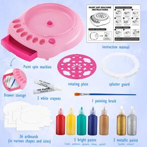 Artes e artesanato para crianças de 4 a 8 anos, kit de máquina de arte giratória, conjunto de artesanato para crianças de 6 a 9 anos, conjunto de kits de brinquedos giratórios de pintura legal, materiais de arte, presentes de aniversário para meninos e meninas de 6 a 7 8 9 10 11 e 12 anos - Máquina de arte giratória de pintura criativa: mergulhe no mundo da arte de respingo, onde você pode criar obras-primas exclusivas e se divertir com a pintura giratória. Liberte sua criatividade com nosso mecanismo giratório durável que garante infinitas sessões artísticas e criações hipnotizantes de arte giratória - Kit de pintura tudo-em-um: este kit de pintura multifuncional tem tudo o que você precisa para começar: uma máquina de girar tinta, uma placa rotativa, um protetor contra respingos, 5 tintas brilhantes, 2 tintas metálicas brilhantes, 36 pranchetas em vários formatos, 1 pincel e 2 giz de cera brancos para efeitos especiais. A máquina de centrifugação de tinta ainda vem com um compartimento de armazenamento conveniente para manter todas as suas tintas bem organizadas - Seguro e fácil de montar: a segurança é nossa principal prioridade, e é por isso que nosso kit de pintura não é tóxico e adequado para crianças, perfeito para jovens artistas. Com um protetor contra respingos e um processo de configuração fácil, este kit garante uma experiência de arte sem bagunça para artistas de todas as idades. Se a velocidade do chassi for lenta ou não conseguir girar, pode ser devido ao acúmulo excessivo de tinta no interior. Basta limpar a tinta interna com um pano úmido; não enxágue com água - Atividade criativa de artes e artesanatos: deixe sua imaginação voar com 7 tintas vibrantes e metálicas, juntamente com 36 pranchetas em diferentes formas e tamanhos para fazer cada criação se destacar de forma única. O kit de máquina de arte giratória de pintura é uma atividade fantástica de artes e artesanato que estimula a criatividade, melhora a exploração de cores, melhora a coordenação motora manual e estimula a expressão artística e o pensamento imaginativo através da arte prática - Presentes de pintura incríveis para crianças: este incrível kit de pintura é um ótimo presente para crianças e adultos! Perfeito para festas de artesanato, atividades artísticas, projetos de sala de aula e muito mais. Seja para feriados, aniversários, dia das crianças, Páscoa, Natal, Dia das Bruxas, Ação de Graças ou Ano Novo, este kit de pintura é um presente maravilhoso para crianças de 6, 7, 8, 9 e 10 anos de idade. Deixe a criatividade fluir com nosso kit de máquina de arte de spin de pintura