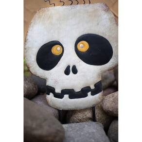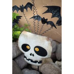 Esta calavera con murciélagos está fabricada en metal pintado. Presenta una calavera blanca con murciélagos negros volando alrededor. Disfrútalo en interiores o exteriores, en una maceta o en el jardín.