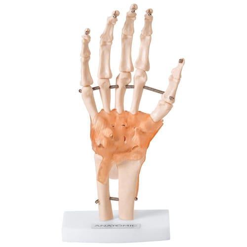 Modelo de articulação, tamanho natural, exibe ligamentos, ossos que compõem a articulação punho. Confeccionado em resina plástica rígida, montado sobre base. Composto por: Ulna: parte distal Rádio: parte distal Ossos do carpo: escafoide, semilunar, piramidal e pisiforme, trapézio, trapezoide, capitato e hamato Ossos do metacarpo: constituído por 5 ossos metacarpianos Ossos dos dedos da mão: 14 falanges, distribuídas em proximal, média e distal Ligamentos articulares do punho O modelo TGD-0162-C permite: Visualizar os ossos: ulna e rádio em sua parte distal. Visualizar os ossos dos dedos da mão, constituído por 14 falanges, 8 ossos do carpo, e 5 ossos do metacarpo. O estudo dos ligamentos das articulações do punho formado por: rádio-ulnar distal e rádio-cárpica. . Acompanha: Manual do usuário Base Embalagem: caixa de papelão Garantia : 1 ano