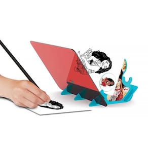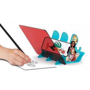Um kit completo para te ensinar a desenhar, vem com peças plásticas para montar a base, lápis e papel. Você encaixa a cartela ou celular com a imagem de Moana e pelo reflexo desenha no papel.