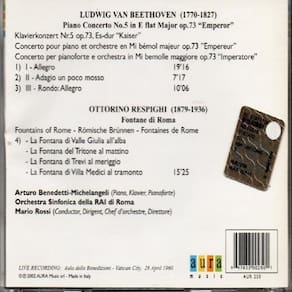Arturo Benedetti-Michelangeli - Concerto para o Papa 1960 Arturo Benedetti juntamente com a Orquestra Sinfônica della RAI di Roma e o regênte Mario Rossi fazem um concerto inesquecível no Vaticano para o Papa Giovanni XXIII, 28 de Abril de 1960. Beethoven - Piano concerto No.5 in E flat Major op.73 ''Emperor'' Respighi - Fontane di Roma