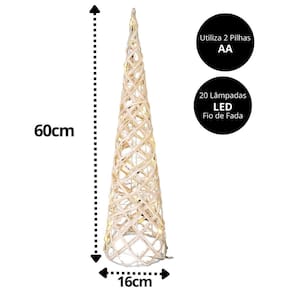 -01 unidade Árvore Rattan Rústico Cone Aramado Iluminado 20 Lâmpadas LED Bege e Branco 60cm