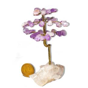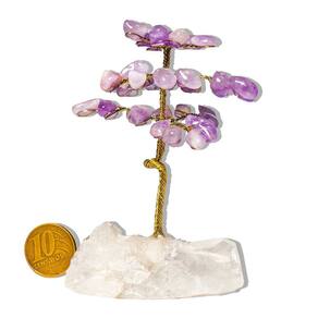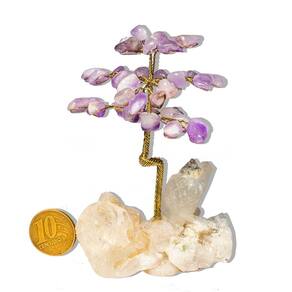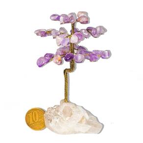 Árvore decorativa artesanal com pedras de ametista roladas, montada manualmente com arame torcido e fixada em uma base de drusa de cristal natural. Cada peça é única, produzida com resina e materiais selecionados diretamente de garimpo do Brasil. Ideal para decoração de ambientes, colecionadores e entusiastas de minerais naturais.   Características do Produto:\nNome da Pedra: Ametista\nCor da Pedra: Roxo (fotos ilustrativas)\nTipo de Corte: Pedra rolada\nTransparência: Opaca\nTamanho Aproximado: 9 cm de altura x 5 cm de largura\nPeso Médio: 100 g (variação conforme o estoque)\nOrigem: Curvelo – MG, Brasil\nMaterial da Base: Drusa de cristal natural\nMontagem: Arame torcido com resina\n  Informações Adicionais:Por se tratar de material natural, podem ocorrer variações de cor, forma e estrutura. Inclusões e marcas internas são características comuns em minerais autênticos de origem bruta. Para melhor conservação da peça, recomenda-se a aplicação ocasional de óleo mineral.