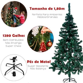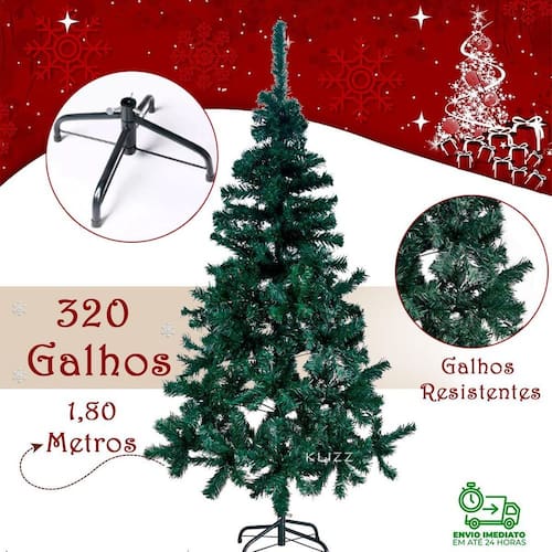 Arvore de Natal 1,80 Metros 320 Galhos Pinheiro Pé de Metal Linda arvore de natal grande para decorar a sua casa em uma das datas mais esperadas e especiais do ano. Medindo 1,80 metros e confeccionada com material resistente, possui 320 galhos articulados, facilitando a montagem e desmontagem. Base retrátil, feita de metal resistente, dando mais sustentação para a árvore.
