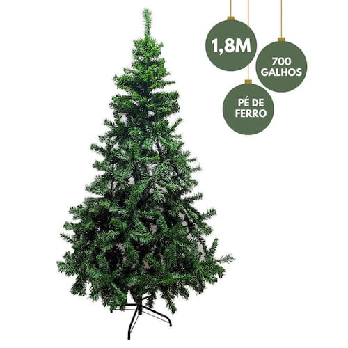 Especificações - Árvore de Natal 1,8m 700 Galhos / Ramos - Cor verde claro, verde escuro - Estrutura em tubo de metal galvanizado e conectores em polietileno - Sistema de montagem: Leque de abrir