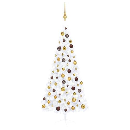 - Esta árvore de Natal artificial meio pré-iluminada é uma adição fabulosa às suas decorações natalinas. Com 70,9 polegadas de altura, foi especialmente projetado para se encaixar perfeitamente em paredes ou cantos, aproveitando ao máximo seu espaço limitado. Adornada com bolas de ouro brilhante, ouro fosco e bronze contra um fundo branco elegante, esta árvore elegante traz calor e charme festivo, criando uma peça central ideal para sua sala de estar ou qualquer local interno nesta época festiva.
