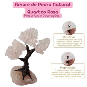 Árvore de Pedra Natural Quartzo Rosa Cascalho Árvore de Pedra Natural Quartzo Rosa Transforme seu espaço com a Árvore de Pedra Natural de Quartzo Rosa, uma peça decorativa que traz não apenas beleza, mas também a energia do amor incondicional. O quartzo rosa é a pedra da cura emocional, promovendo uma sensação de paz e equilíbrio. Pedra Quartzo Rosa: O quartzo rosa é considerado o Cristal do Amor. Ele promove o amor próprio, a compreensão e a empatia, tanto para com os outros quanto para com si mesmo. Ele é utilizado para ajudar as pessoas a se reconciliarem com suas emoções e a fortalecerem os vínculos afetivos, ajudando a liberar traumas e ressentimentos do passado. É excelente para quem está lidando com luto, solidão ou mágoas antigas, pois ajuda a suavizar o coração e aliviar as emoções dolorosas. Enviamos a sua encomenda em até 24 horas após a confirmação do pagamento Dimensão aproximada: Altura: Largura: Caso tenha alguma dúvida nos mande mensagem que responderemos rapidinho para te ajudar da melhor forma possível